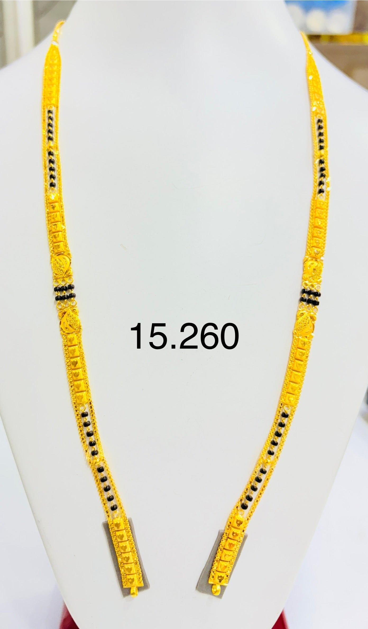 Celebrate sacred traditions with the Long Patta Mangalsutra, a symbol of everlasting love and marital harmony. Weighing 15.260 grams, this elegant piece is designed with a long, graceful chain adorned with classic black beads and a beautifully crafted gold patta (pendant). The design blends time-honored symbolism with a modern, lightweight feel — perfect for everyday wear or special occasions.